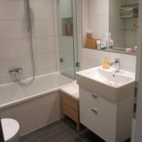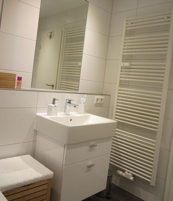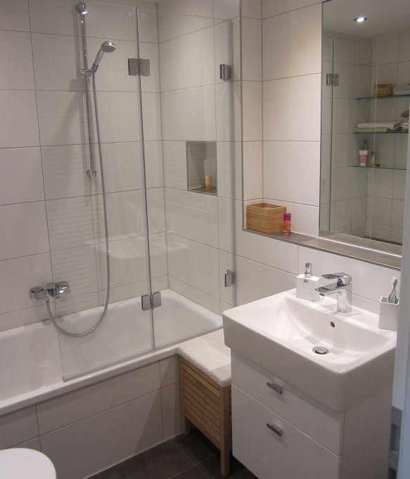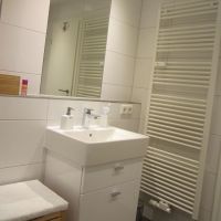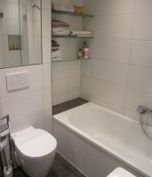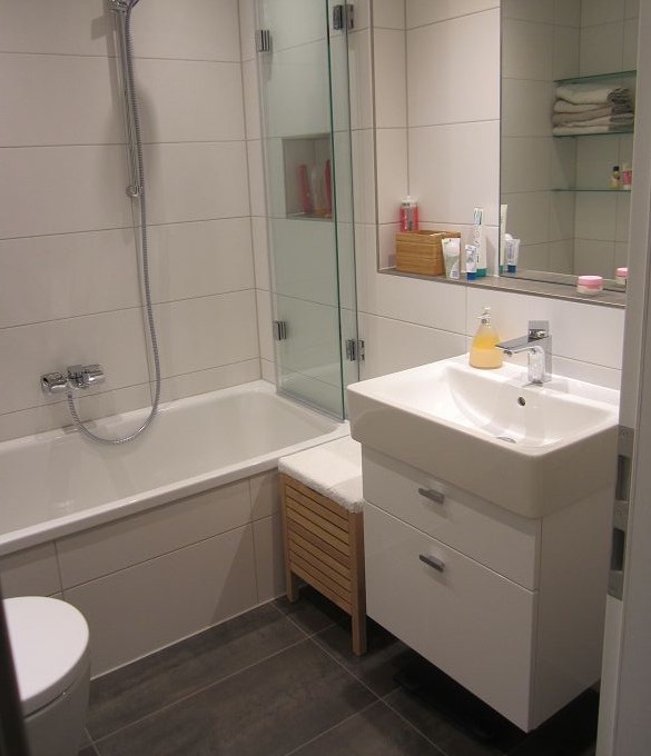 Der Einsatz von weißem Porzellan, leicht abgetönten großflächigen Wandfliesen und dunklen großformatigen Bodenfliesen gibt den Bädern einen Charakter zeitloser Eleganz. Um die Bäder grösser wirken zu lassen, wurden große Spiegel und Spiegeleinbauschränke, Glasregale und Glas-Duschabtrennungen verbaut.